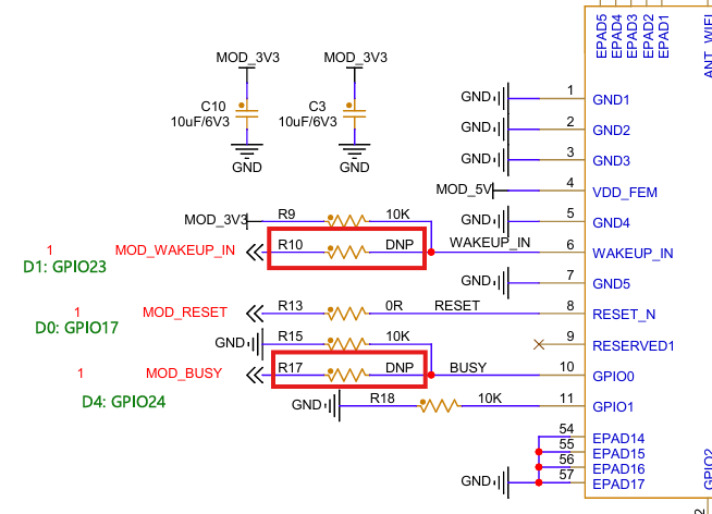 The Seeed XIAO HaLow module has two DNP (Do Not Populate) resistors near the WAKE and BUSY pins on the PCB.